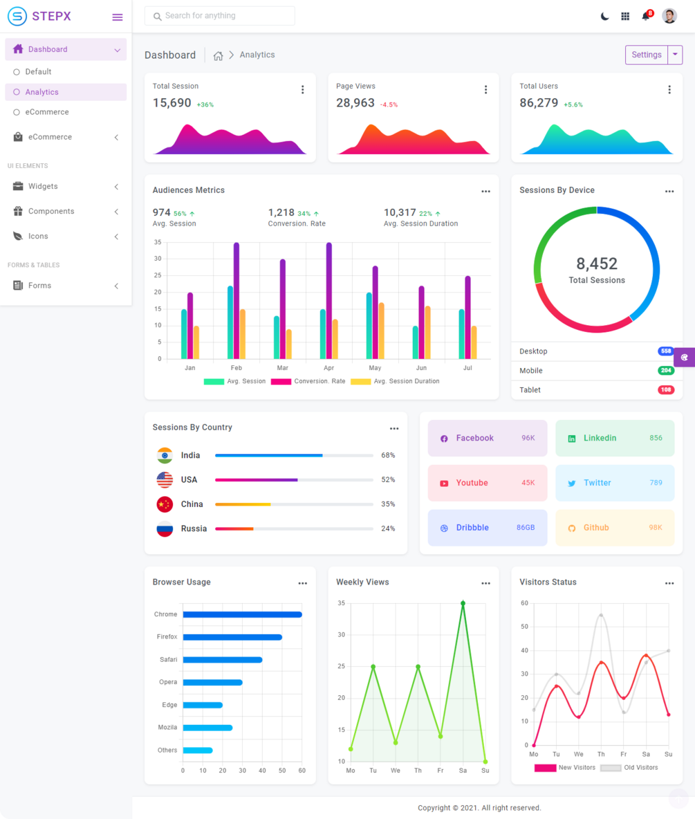 STEPX-UI is a responsive bootstrap 5 admin template. It has multiple dashboard variations. It is built with the latest bootstrap 5 frameworks. It works on all major web browsers, desktops, and all smartphone devices. It is a very easy-to-customize and developer-friendly template.